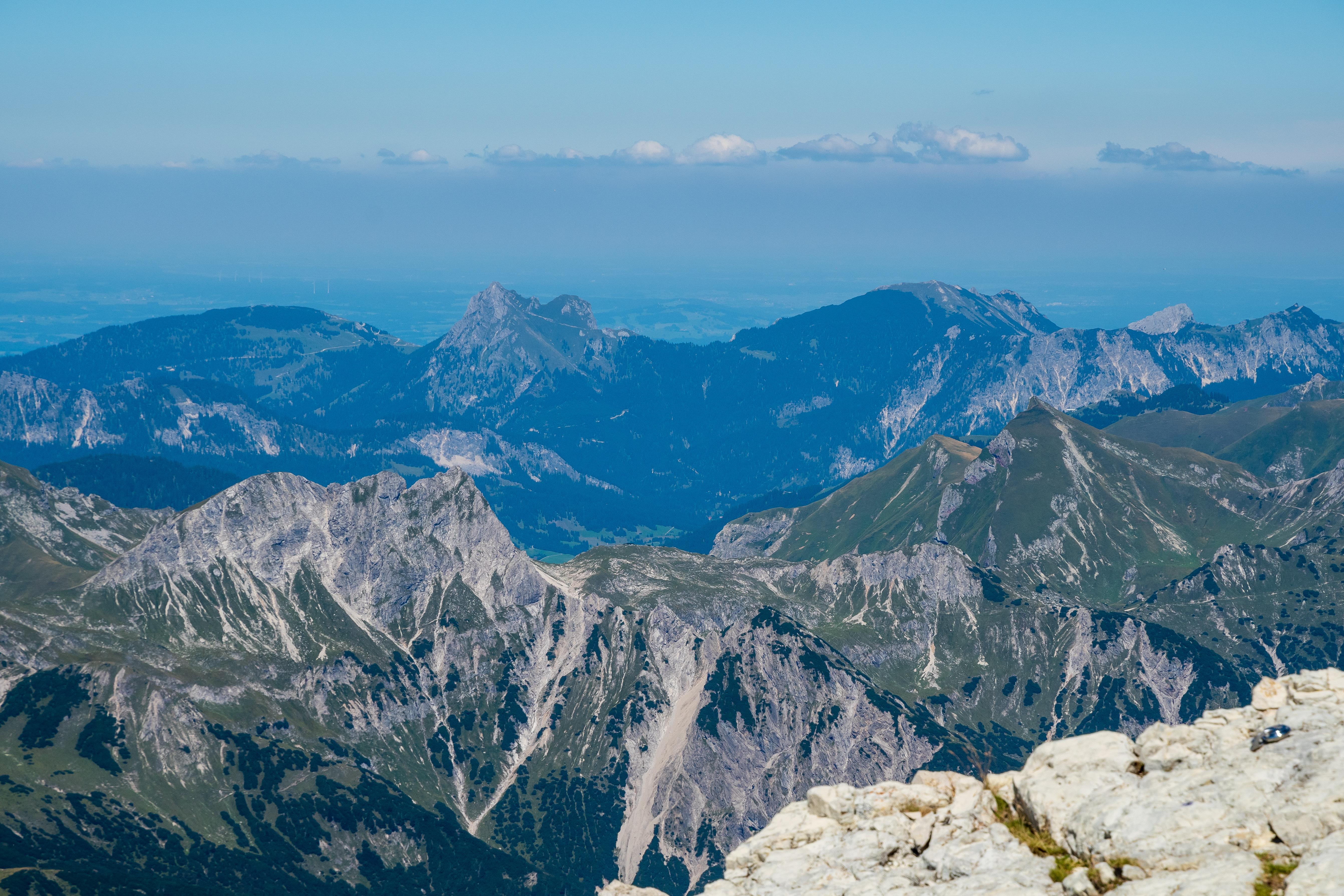Links das Rauhhorn, mittig der Aggenstein und direkt rechts daneben der Auerberg im Dunst