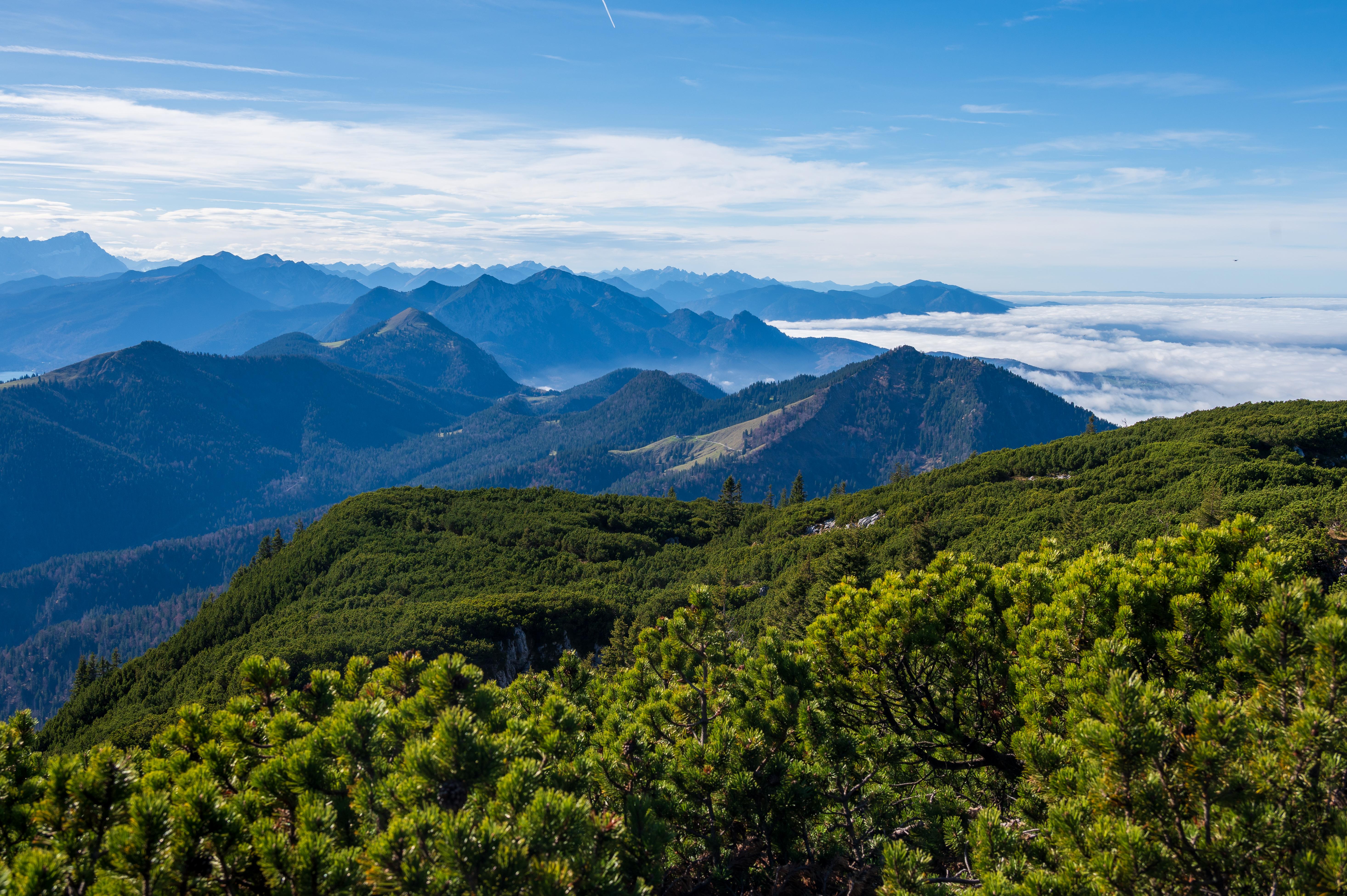 Blick über den Rabenkopf und Jochberg zum Heimgarten, dahinter die Ammergauer Hörnlegruppe
