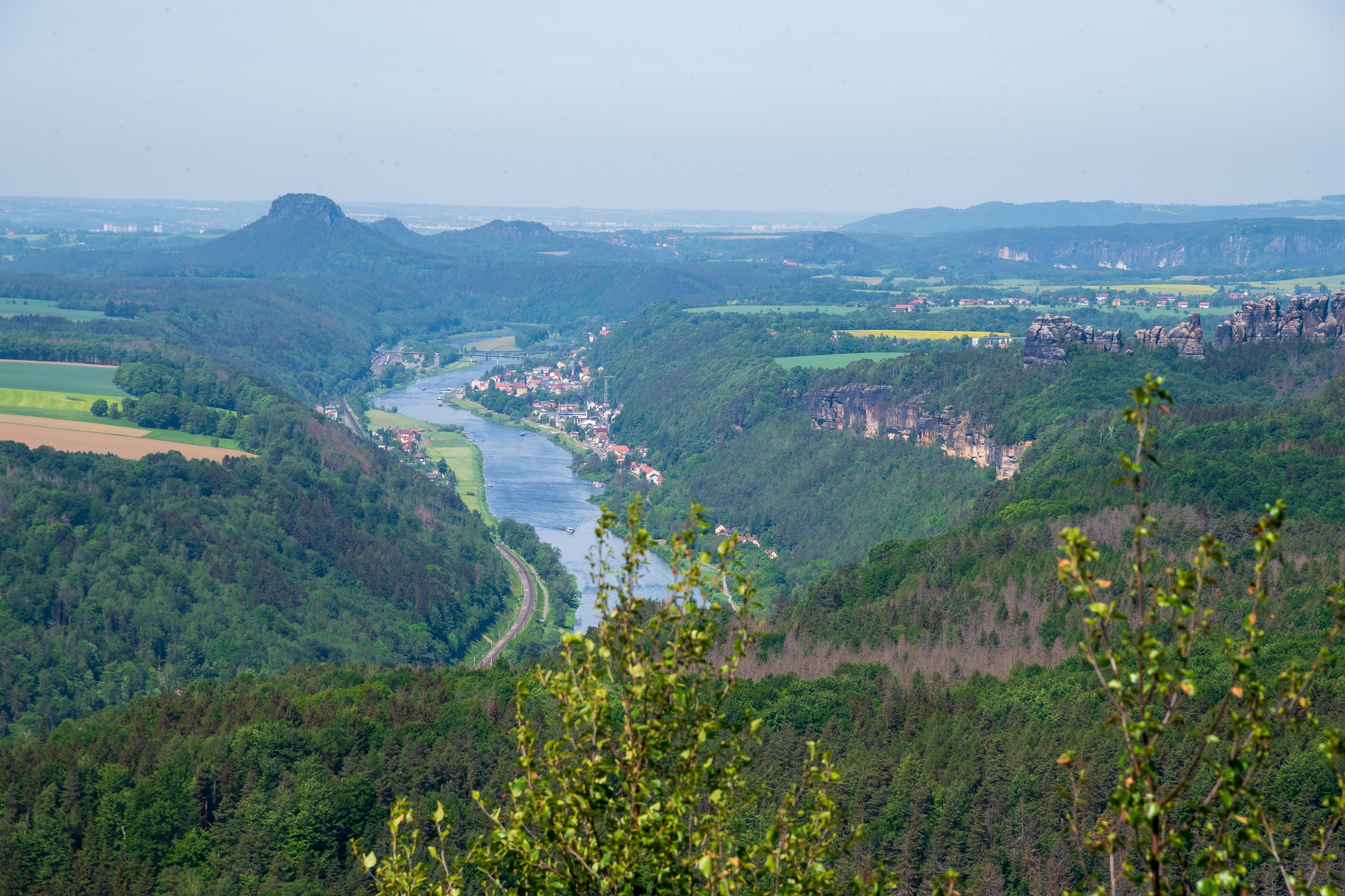 Im Bild: Pfaffenstein, Festung Königsstein, Lilienstein, davor die Elbe mit Krippen und Bad Schandau