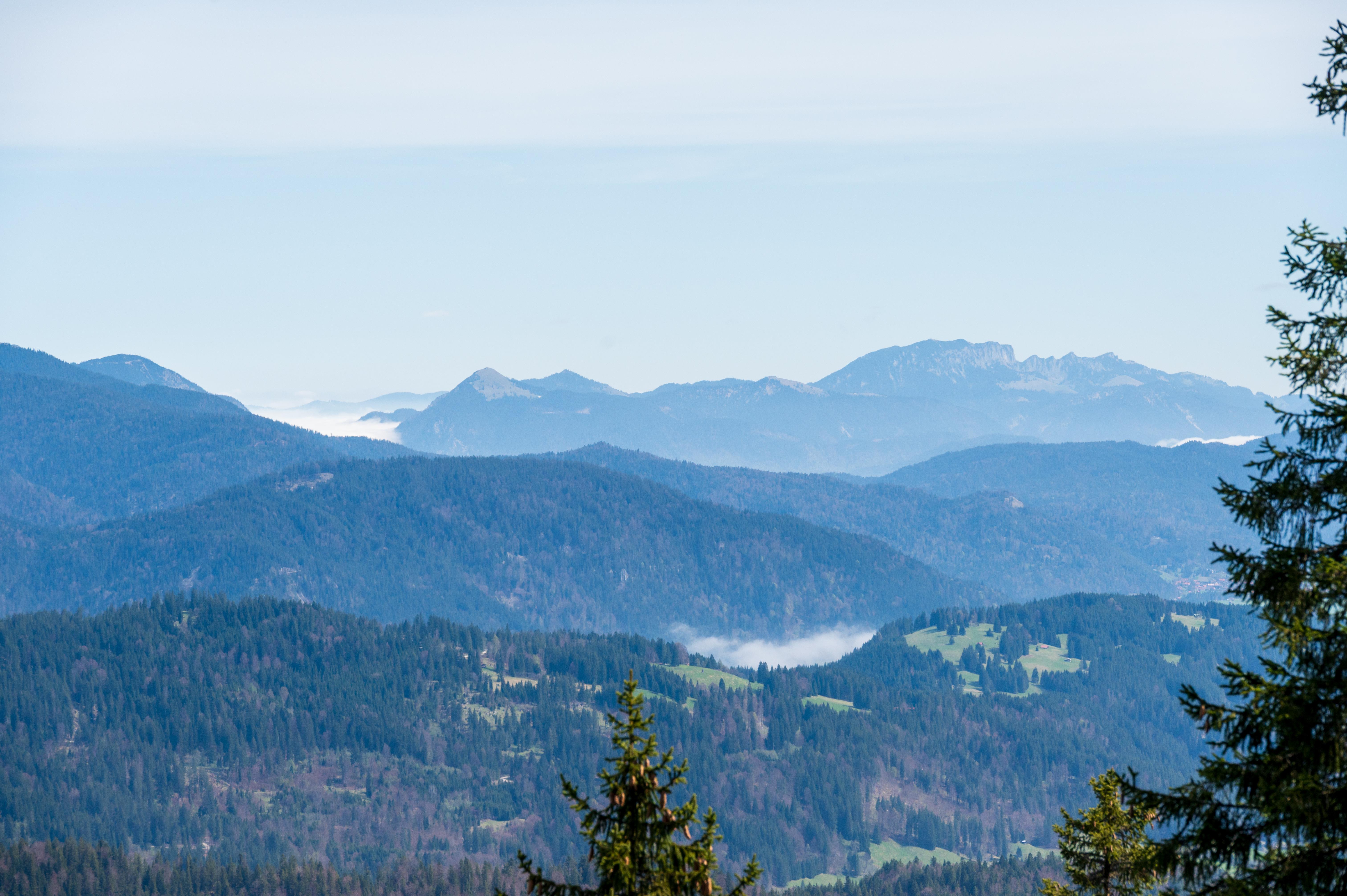 Jochberg und Benediktenwand, dazwischen der Rabenkopf und links der Fahrenbergkopf